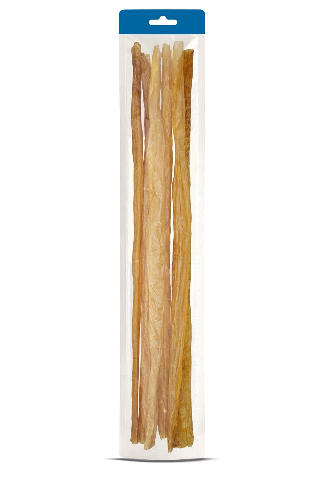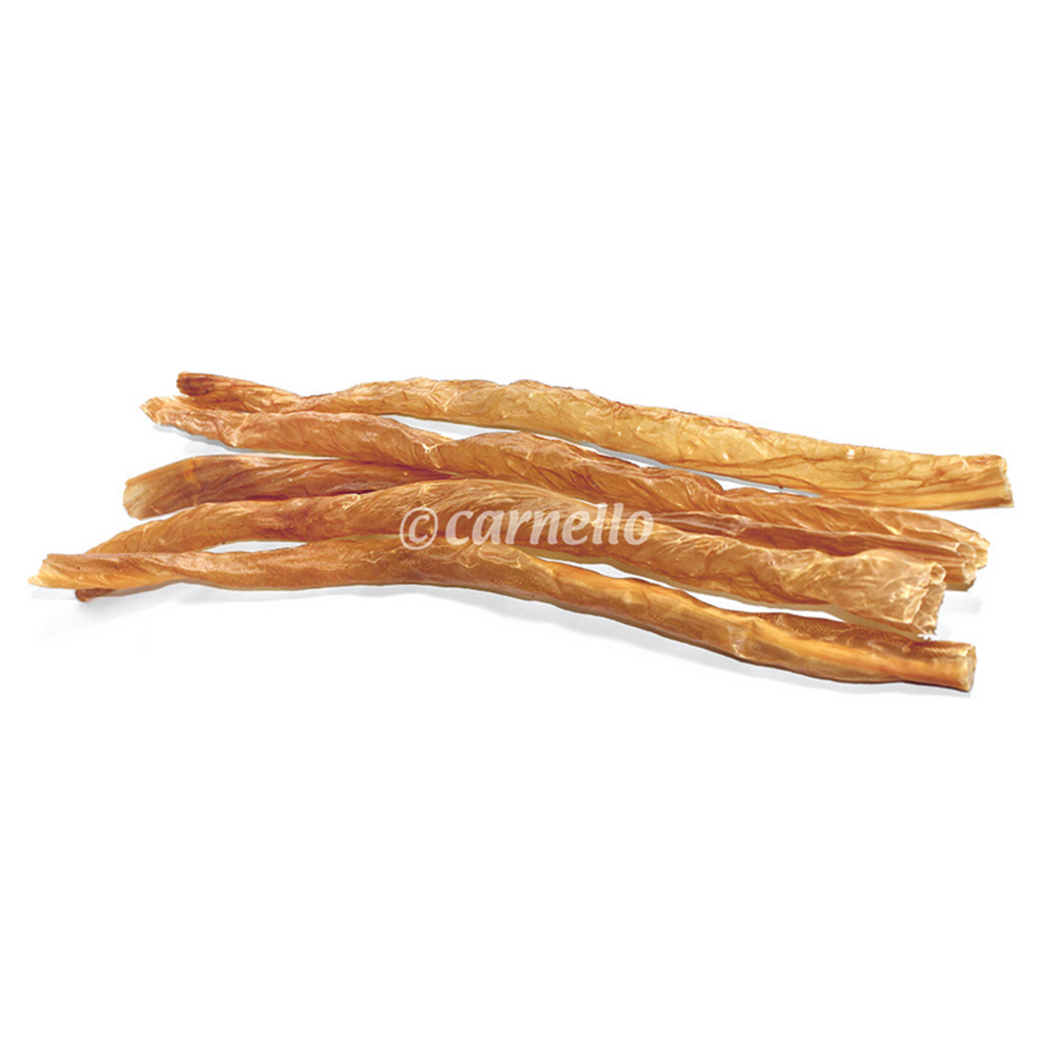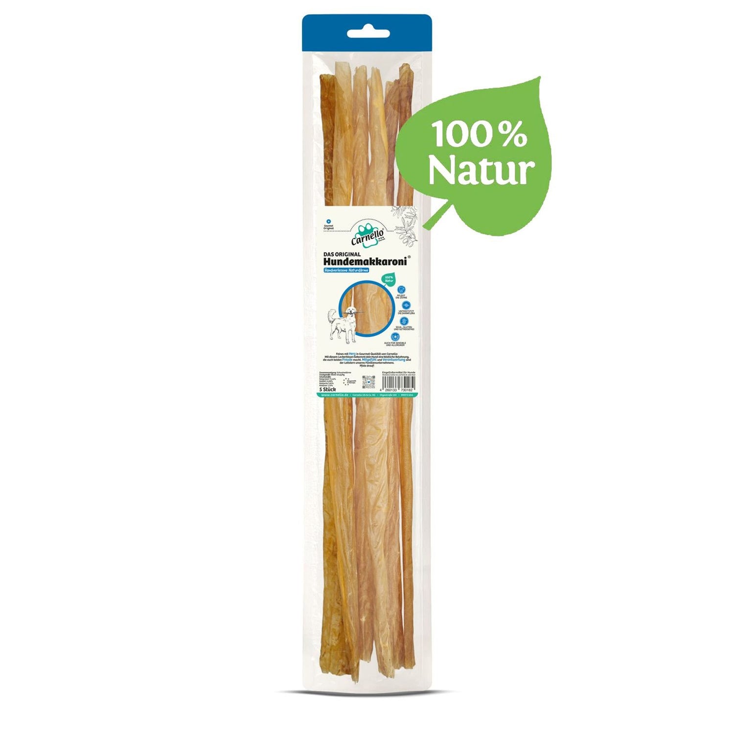 Das Carnello-Sortiment ist um ein weiteres Produkt gewachsen &ndash- die Hundemakkaroni®- .Damit gibt es von Carnello nun endlich auch ein Leckerlie für die etwas grö-ßeren Hunde.Die Hundemakkaroni®- sind nicht nur eine Innovation, sondern eine echte Weltneuheit. Sie bestehen aus Schweinedärmen, die einzeln auf eine einzigartige Weise getrocknet werden. Dadurch werden sie so schö-n voluminö-s und haben fast 60% weniger Fett. Somit sind sie auch für Hunde bestens geeignet, die fettarm ernährt werden. Das in den Hundemakkaroni®- enthaltene Biotin trägt außerdem zu einem gesunden, glänzenden Fell bei.Dieser Snack ist ein Naturprodukt und auch für empfindliche Hunde und Hunde mit Allergien sehr gut geeignet. Die Stangen sind jedoch kein Kauartikel und wenn der Hund besonders lange kauen soll, wären die Hundecroissants®- oder die Hunde-Stickys®- die richtige Wahl.Die Hundemakkaroni®- sind eine Gourmet-Delikatesse, die in kleinster Auflage hergestellt wird für besondere Gelegenheiten und besondere Feinschmecker.Jeder der fast 50 cm Länge ist ein Genuss!Dieser Snack ist zu 100% ein reines Naturprodukt und enthält keinerlei künstliche oder sonstige Zusätze. Damit ist er auch für empfindliche Hunde und Hunde mit Allergien bestens geeignet.Angst vor Aujeszky ? Seien Sie unbesorgt! Wir machen für Ihr Tier die dreifache Absicherung. Zum einen stammt unsere hochwertige europäische Rohware ausschließlich aus der bereits überprüften und freigegebenen Lebensmittelproduktion (alternative Verwendung als Wurstpelle etc.).Bei der Herstellung werden die Därme gereinigt, handverlesen und während des Trocknungsprozesses so behandelt und nach gesetzlichen Vorschriften erhitzt, dass jegliche mö-glicherweise noch vorhandenen Erreger garantiert abgetö-tet würden. In der Produktion sind Tierärzte für die Qualitätssicherung zuständig und zusätzlich werden die fertigen Produkte laufend von den Veterinärbehö-rden kontrolliert. Somit ist sichergestellt, dass eine Übertragung von dem Virus auf Hund und Katze ausgeschlossen werden kann. Hinweis: Bei Zimmertemperatur und trocken lagern- sehr starke Erwärmung/Kühlung vermeiden