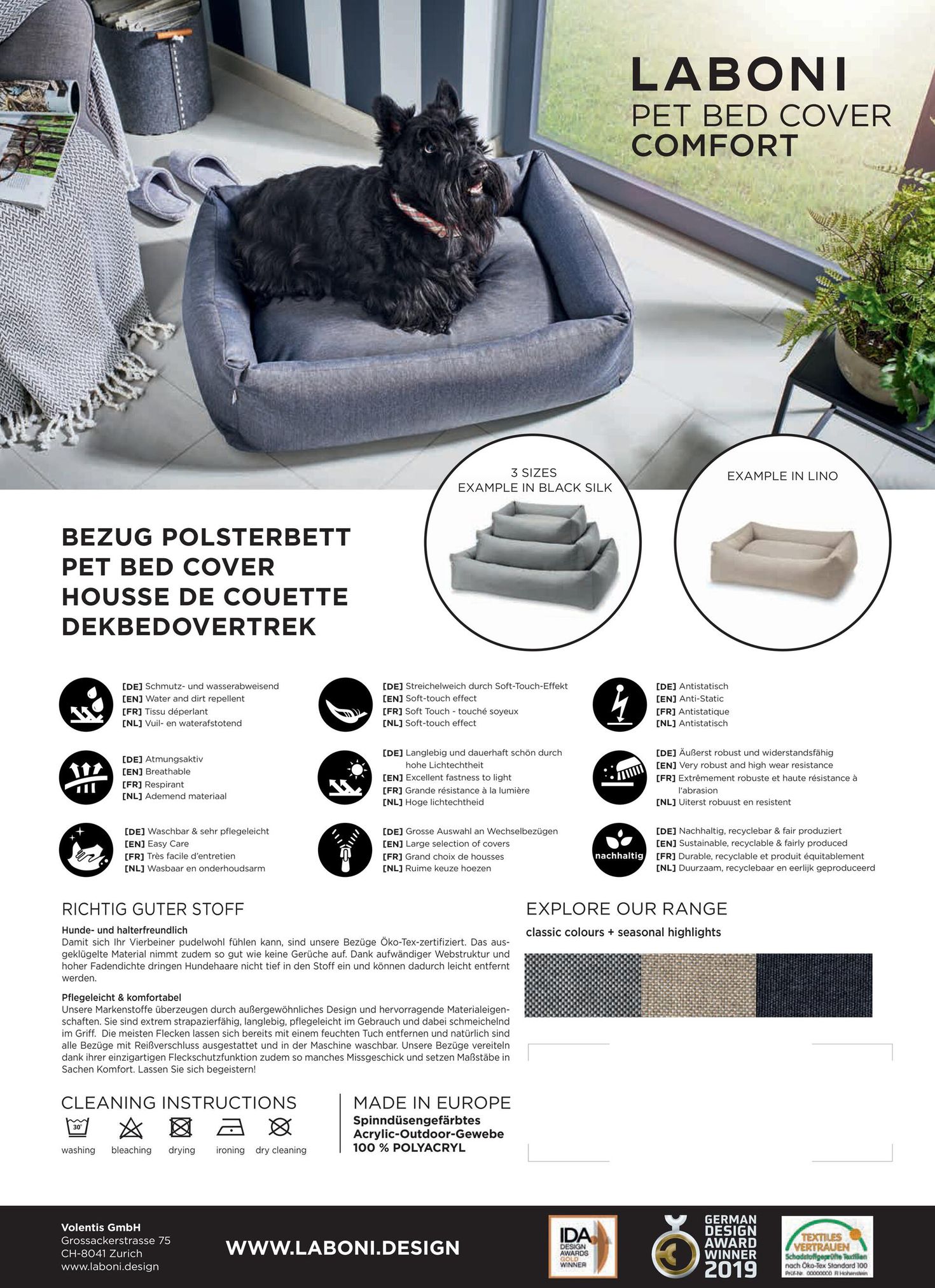 Die Bezüge der SMOOTH-Kollektion passen auf alle LABONI Polsterbetten und überzeugen durch erstklassige Materialien und ihre besonders guten Pflegeeigenschaften. Der leicht strukturierte und besonders hochwertige Stoff aus widerstandsfähigem Outdoor-Gewebe verleiht deinem Hundebettbezug einen edlen Look und ist perfekt geeignet für drinnen und draußen. Kratzresistent und 100 % lichtecht, behält der hochwertige Stoff des Hundebetts auch nach Jahren im Gebrauch sein Aussehen, sodass du lange Freude an diesem exklusiven Marken-Produkt von LABONI haben wirst.